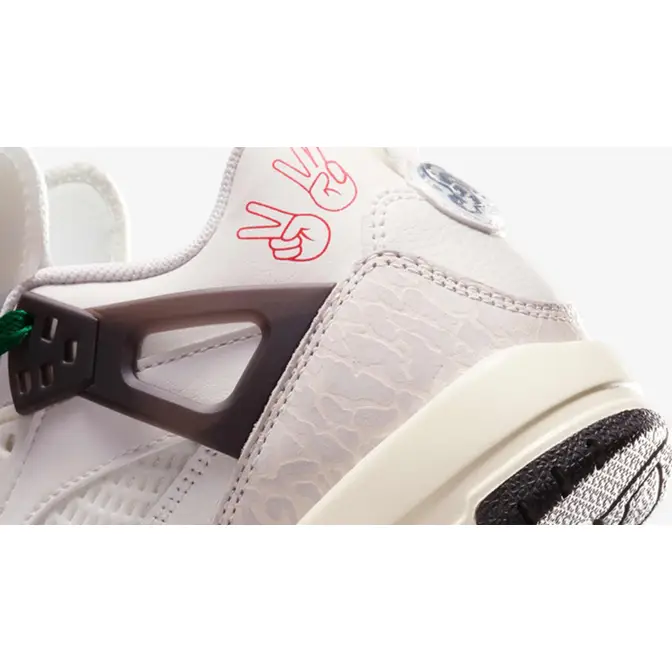 Das Upper besteht aus glattem Leder in Sail Weiß, kombiniert mit neutralem Elephant Print an Zehen und Ferse. Auf dem seitlichen Mudguard befindet sich eine handgezeichnete Spizike Was Here Grafik, während auf der Ferse Spike Lee Embleme und das Logo seiner Produktionsfirma 40 Acres and a Mule Filmworks zu sehen sind.